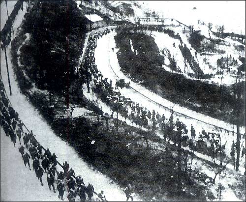 During the South Guangxi Campaign the Chinese army heavily mauled the Japanese forces at Kunlunguan Pass. Photo shows Chinese troops advancing.