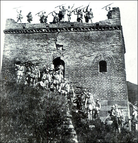 Soldiers of the Eighth Route Army hail their victory in the second phase of the "Hundred-Regiment Campaign" in an ancient castle of the Great Wall.