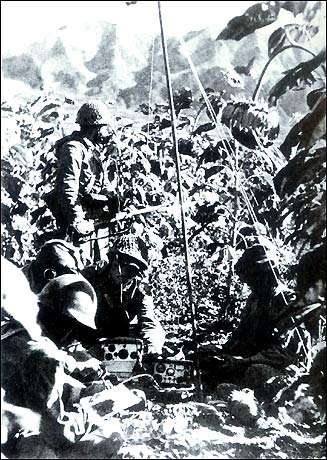The Japanese army occupied Guangling county town in north Shanxi on September 14, 1937, and advanced on Pingxingguan Pass. Picture shows the signalmen of the Japanese forces marching on Guangling.