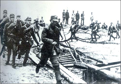 The defensive battle for Wuhan started fully in October 1938. Shown are Chinese troops rushing to the Wuhan front.