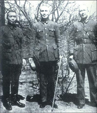 Chiang Kai-shek (middle) at the Taierzhuang front with Bai Chongxi (right), frontline commander in the Xuzhou Campaign, and Li Zongren, commander of the First Reserve Army.