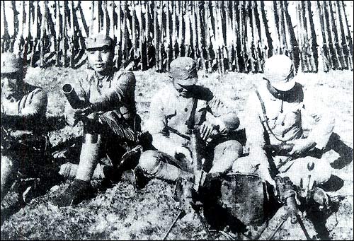 Japanese troops launched an attack on the key town of Xinkou, Shanxi, on October 13, 1937. A total 80,000 Chinese troops left after 20 days of fierce fighting. Shown are Chinese defending troops checking captured Japanese weapons.