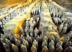 In 221 B.C., Ying Zheng, ruler of the State of Qin and a man of great talent and bold vision, ended the 250-odd years of rivalry among the independent principalities during the Warring States Period, establishing the first centralized, unified, multi-ethnic feudal state in Chinese history?the Qin Dynasty (221-207 B.C.). He called himself Qin Shi Huang or ?First Emperor of Qin.? He standardized the written script, weights and measures, and currencies, and established the system of prefectures and counties. The sovereigns of the next 2,000-odd years followed the feudal governmental structure established by him. He mobilized more than 300,000 people over a period of a dozen years to build the Great Wall, which stretches for 5,000 km in northern China. Qin Shi Huang had work on his enormous mausoleum started early in his reign. The terracotta warriors of the ?underground army? guarding the mausoleum, unearthed in 1974, amazed the world. The 8,000 vivid, life-size pottery figures, horses and chariots have been called the ?eighth wonder of the world.?