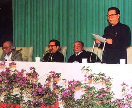 At the turn of spring and summer, 1989, under the influence of the international and domestic climate, there was a rampant tide of bourgeois liberalization, eventually leading to the turmoil and counterrevolutionary rebellion. Representing the fundamental interest of the people, the CPC Central Committee took resolute and timely measures to curb the turmoil and quell the counterrevolutionary rebellion. As a result, the fruits of the Chinese revolution and construction and the socialist system were safeguarded. At the Fourth Plenary Session of the Thirteenth Central Committee of the CPC, a new central leadership, with Jiang Zemin at the core, was elected. Since then, the Party has carried out the basic line of "one focus, two basic points" initiated by Deng Xiaoping. It has taken a clear-cut position of adhering to the Four Cardinal Principles, continuing with improving the economic environment and rectifying the economic order and deepening the reform. It has also strengthened the building of the Party and the ideological and political work. As a result, the socialist modernization construction is gaining further development. With full confidence, people of the whole country have united around the Party and are striving to build a powerful socialist modern country.