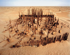 Then they headed northeast and entered the dry sands of the Lop Nur. As they traversed countless hills of sand, all seemingly low and regular, the team came upon a particularly huge dune carpeted by an array of dense wood stakes. They had arrived at the No.5 Cemetery of Xiaohe Tombs.