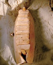 Perhaps the most important discovery in the latest excavation is the few clay coffins. Unearthed from the bottom layer of the tomb were four clay-covered wooden coffins, each surrounded by a circle of six or eight high wood stakes. The coffin covers, in rectangular shape, were wrapped with thick clay. Under the covers were wood chambers, in which straw baskets and wood articles were buried along with each of the deceased. Discovered beneath the wood chambers were boat-shaped coffins for the female dead. In death, they were accompanied by such articles as wool capes, gold earrings, wool necklaces and wood-sculpted male genitalia.