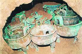Of great significance to broadening an understanding of these far off days are the 12 bronze dings (cooking vessels with two loop handles and three or four legs) for each bears a rare 300-word inscription. These records, kept safe in bronze down all these years, are unique for they list 11 of the 12 Western Zhou Dynasty kings. Only King You, the last of his Dynasty is not included. What's more, the inscriptions record the parallel relationships between eight generations of the Shan Clan and the 12 Western Zhou kings. Not only do they put dates on the Western Zhou but they are also proving valuable in establishing a timeline for the Bronze Age of the Western Zhou Dynasty and the chronology of the Xia, Shang and Zhou dynasties. Meanwhile the inscriptions have been providing important reference materials for understanding the clan history of the Shan family and the relationship between the Zhou Dynasty and northwest ethnic groups.