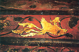In the main chamber they found murals depicting the sun and the moon on each wall and the coffin, which was the most precious of all the relics. It rested undisturbed on a platform of eight colored supporting tiers where it had been placed all these long years ago. The red and black outer coffin, 2.3 meters long, 1.3 meters wide and 0.9 meters high, was decorated with images of cranes, phoenixes, peonies and clouds. The gilded cranes and peonies shone bright and wonderful for they had not lost their colors even though a millennium might have come and gone in the world outside. Wrapped in silk, the inner cypress wood coffin was some 1.6 meters long with colored golden dragons and flying phoenixes worked in bas-relief on the lid.