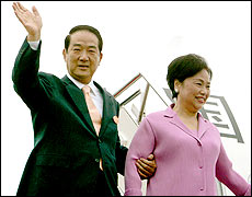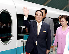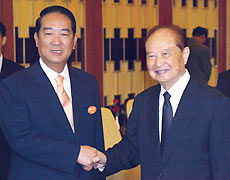 | Soong (L.) meets Wang Daohan, president of the mainland-based Association for Relations Across the Taiwan Straits in Shanghai on May 8. |