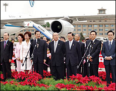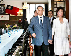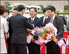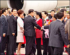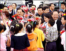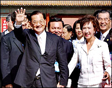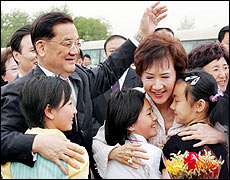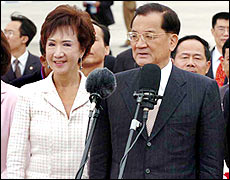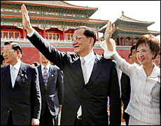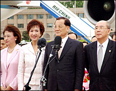 Lien and his wife arrive in Beijing on April 28, 2005.