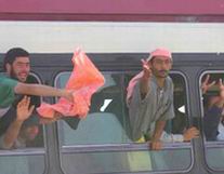 Men wearing Arab traditional clothes in the red-white striped buses waved their hands toward the crowd waiting there since the wee hours.