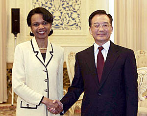 During her meeting with Hu, Rice said the US Government attaches great importance to developing US-China constructive and co-operative ties, and that people around the world are watching the "remarkable transformation" that is going on in China.