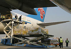 Chinese workers load relief goods for tsunami victims onto a cargo plane to Indonesia on Sunday, Jan. 2, 2004, at the Beijing Capital International Airport.