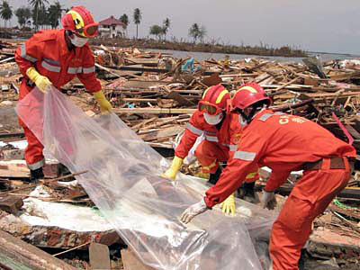 Members of the Chinese rescue team wrap up a tsunami victim's body in a tsunami-hit area in Banda Aceh, capital of Indonesia's Aceh Province, Jan. 3, 2005. The Chinese team arrived in Indonesia Dec. 30, 2004.