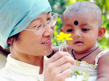 | Liu Zuohui, member of the Chinese medical rescue team, comforts a sick child with a flower in the town of Hikkaduwa, some 90 kilometers away from Colombo, capital of tsunami-stricken Sri Lanka, Jan. 6, 2005. The 14-member Chinese medical team started relief work here on Jan. 4. |