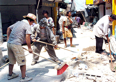 | Rebuilders dredging drainage systems in Koh Phi Phi Island, Krabi, Thailand. Travelers are now coming back to the island after the earthquake-triggered tsunami on December 26. The island is a 50-minute boat-ride from Phuket. Before the tsunami, at least 10 boats a day left Phuket bearing tourists to the island. |