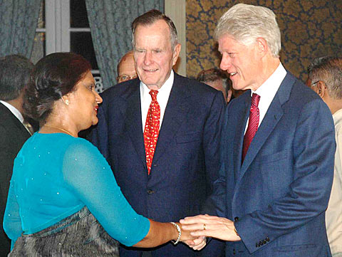 | President Chandrika Kumaratunga welcoming the two former US presidents Bill Clinton and George Bush Senior on Feb. 20 in Sri Lanka, the third leg of their four-nation tour of tsunami-hit countries. They have been appointed by President George W. Bush to head US fundraising efforts in the wake of the tsunamis that killed more than 280,000 people in Asia. |