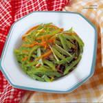 Ingredients: 250 grams (0.55 lb) balsam pears 50 grams (0.11 lb) carrots 20 grams (1 1/2 tbsp) salad oil 3 grams (2/3 tsp) sugar 1 head of garlic 5 grams (1/6 oz) scallions 5 grams (1/6 oz) ginger 5 grams (1 tsp) sesame oil