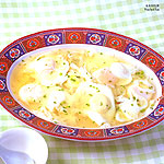 1. Heat water over strong fire and turn to low fire when the water boils. One by one, crack the eggs into the boiling water and push them gently with a ladle so as not to let the eggs get stuck to the bottom of the pot. When they rise, put on the pot cover for 2 minutes. Drop the eggs into a soup bowl.