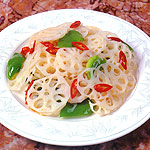 Ingredients: 200 grams (0.44 lb) fresh lotus roots 50 grams (0.11 lb) green peppers 10 grams (1/3 oz) red chili 2 grams (1/3 tsp)salt 1 gram (1/4 tsp) MSG 1 gram (1/4 tsp) sugar 10 grams (2 tsp) water 50 grams (3 1/2 tbsp) cooking oil