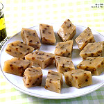 2. Mix the two kinds of rice flours. Add the sugar, oil and the cooled off beans and mix well. Put the mixture in a porcelain plate on whose surface oil has been rubbed. Steam for 45 minutes and the cakes are ready.