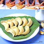 2. Add 150 g (10 tbsp) of hot water into the flour, mix, roll and shape into something like a roller. Reduce it into pieces each 15 g (1/2 oz) in weight and press into a round wrapping. Now put in the weight and press the edge to create a crescent shape. Put the dumpling on a steamer tray and when the water boils, steam for 10 minutes and they are ready.