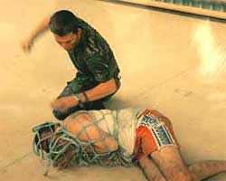 "This Iraqi is tied in a cargo net. He also has his hands tied. He is suspended from the raised forks of the forklift truck," Clapham explained.
