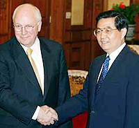 Chinese President Hu Jintao met in Beijing Wednesday with visiting US Vice President Dick Cheney. The two sides exchanged views on bilateral ties, Taiwan, and the nuclear issue on the Korean Peninsula.