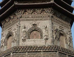 The first storey of the pagoda is majestic, typical of the multi-eaved style of the Liao and Kin dynasties. A false arch decorates the four sides facing the four directions; the other four sides have false windows. Carved on the headpiece of the arches are cloud and dragon patterns. Sculptures of vajra guardians, made of clay over wooden frames, flank the arches. The windows are decorated with little statues of seated Buddha and cloud patterns. Relief sculptures of bodhisattvas flank the windows. Eight brick columns decorated with dragon patterns stand at the corners of the pagoda. The name of the pagoda -- Yong'anwanshoo Pagoda -- is inscribed on the stone headpiece of the southern arch. Thirteen levels of eaves rise above the first storey. The steeple is supported by a pedestal with ornamental lotus petals and surmounted by a precious bead, resembling Tianning Temple Pagoda.