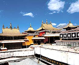 Built in 648, the Jokhang Monastery expanded to the present scale in the 17th century after several renovations. Located on Barkhor Street, Lhasa, it faces west and has four stories with the roofs covered with gilded bronze tiles. It was built in Tang Dynasty architectural style with characteristics of Nepalese and Indian architecture. The main hall is supported by 20 large wooden columns. There are elegant relief sculptures of human beings, birds and animals carved on the bucket-arch beams. A golden statue of the young Buddha Sakyamuni at age 12 brought to Tibet by Princess Wen Cheng from Chang'an, capital of the Tang Dynasty, is enshrined in the center. The statutes of Songtsen Gampo, Princess Wencheng and Princess Chizun, another wife of the Tibetan King are enshrined in side halls.