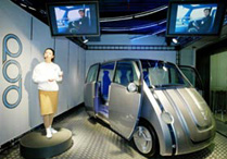 A Sony employee introduces a futuristic concept car POD, which was jointly developed by Sony and Toyota, during the Sony Techno Week in Beijing Monday, Oct. 28, 2002.