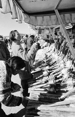 Religious objects such as prayer wheels have become the most important souvenirs much favored by tourists.