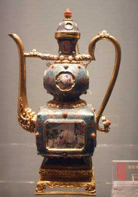 The picture taken on Oct. 11, 2004 shows an enamel jug with gold base on display in the Treasure Museum in the Forbidden City in Beijing.