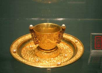 The picture taken on Oct. 11, 2004 shows a gold cup and its tray on display in the Treasure Museum in the Forbidden City in Beijing.