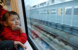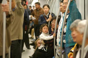 A small girl looks out of the metro window at a carriage of Nanjing metro line, east China's Jiangsu Province, May 15, 2005.