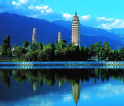 The Chongsheng Pagodas are laid out in a triangle at the foot of Mount Cangshan. The construction of the pagodas began in the Tang Dynasty (618-907) and was completed in the Song Dynasty (960-1279). The principal pagoda is 69.13 meters high and each of the other two is 43 meters high, all having the same appearance. The pagodas have become landmarks in Dali City.