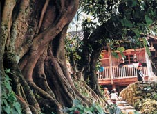 There are other uniquely shaped trees in the village, one of them the Husband and Wife Tree. Seen from a distance, it appears to have three different types of leaf, but it is actually one camphor tree overlooked by a big banyan that has another pointed leaf banyan growing out of it, five to six meters above ground level.