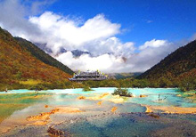 獨(dú)特の自然景観で國(guó)內(nèi)外に知られる名所?黃龍風(fēng)景區(qū)は、四川省北部の阿ハ藏族羌族自治州?松潘県內(nèi)に位置する。地表が薄い黃色の厚いカルシウム化合物の層に覆われ、樹(shù)海の中でうねる黃金の巨龍を思わせることから、命名された。黃龍は1992年、國(guó)連教育科學(xué)文化機(jī)関(ユネスコ)により世界遺産に登録された。