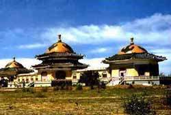 12世紀頃のモンゴル族の首領?ジンギスカン(1162-1227年)の陵墓である。伊金霍洛旗に位置する。包頭から南へ東勝を経由して120km。主體建築は3つのモンゴル族の住居、パオの形をした大殿からなっており、中央は記念堂になっている。記念堂の裏にジンギスカン夫婦の柩が安置されている。陵墓全體は壯大で、線香の煙がゆらぎ、國內外からの參拝客は多い。毎年4回の正式祭祀活動があり、盛大でにぎやかである。