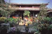 街の西にある獅子山には、木造、五層の樓閣があり「萬古樓」と呼ばれる。上層からは麗江の街が遙かに見渡せ、15キロ離れた玉竜雪山も遠くに見える。獅子山のふもとに、かなりの規模の建築群が目に入るが、それは明代以來、この地を支配した土司(土地の少數民族の指導者に皇帝が與えた世襲の官職)の木氏の官邸だ。清代以降、建物は何度も破壊され無殘な狀態になっていたが、近年、修復された。官邸に入ると、まず石の牌坊(鳥居形の門)が目につく。そこには「聖旨」「忠義」と文字が刻まれた二枚のへん額が上下に掲げられている。明の神宗(1573~1620年)の筆と伝えられるもので、當時の土司と中央政権との密接さを見て取ることができる。ただしこの牌坊の原物は「文化大革命」中に破壊されており、今の建物は近年復元されたものだ。それは確かに一つの代替品にはなっているが、ナーシー族の