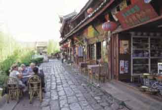 まずは麗江を訪れたほとんどすべての人が行く四方街に向かった。この通りは、東西に約150メートル、道幅は約25メートル。道に沿ってぎっしりと店舗が並ぶため「四方街」と呼ばれる。またナーシー族の言葉では「ジルグ」と呼ばれ、それは「街の中心」という意味だという。元代初期に露天の市場として始まり、清代にはすでに相當の規模になっていたという。當時、市場では土地の布や、穀物、野菜、酒、薪などが売られていた。今もここは街の商いの中心で、店では麗江特産の手作りの銅器、ナーシー族の民族衣裝、ナーシー族に伝わるトンバ文字を刻んだ工蕓品、高原で採れる希少な漢方薬材、土地の食品などが売られている。だから麗江を訪れた人は、ここを見學し、旅行の記念の品を買うことになる。 四方街は六本の通りとつながっていて、ここから麗江のどこにでも行くことができる。通りには石畳が敷かれており、ところによってそれが縦並びになっていたり、橫並びになっていたりする。聞くところでは、往時、不案內な旅人でもインドへ向かう道と、チベットへ向かう道をすぐ見分けることができるように、敷き方が工夫されていたのだという。