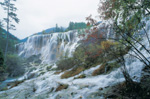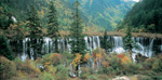 九寨溝にある17の瀑布のうち、よく知られるのが「樹正」「諾日朗」「珍珠灘」の三大瀑布である。「樹正瀑布」は、「九寨溝の縮図」と呼ばれる「樹正溝」に位置する。上流の河がゆっくりと淺瀬をすぎて、崖の端の樹木に分けられ、無數(shù)の水の束をつくる。その瞬間、弓なりになった山崖から水流がほとばしり落ちていく。