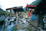 樹正溝の樹正チベット族の寨の外には、一列にならんだ九つの白い仏塔「九寶蓮華菩提塔」がある。その両側(cè)には二つの亭があり、亭のなかには銅製の「転経筒」がある。チベット族が住む集落には、どこでも必ず転経筒があり、そのなかには多くの経巻が収められている。チベット仏教の信仰者は、転経筒を一回まわすごとに、筒のなかの経文が百回念仏でき、功徳を積んだことになると考えている。樹正瀑布の急流のなかには転経筒をそなえた木造の小屋がいくつも設(shè)けられ、それが「水転経」と呼ばれている。人々は水力利用で経筒が日夜まわり続けるようにしており、チベット仏教へのあつい信仰を表しているのである。