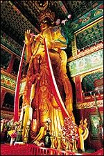 余り、高さ約5メートル、厚さ30センチ。金や銀、銅、鉄、スズの5種類の金屬で製作された「五百羅漢」は雍和宮で「3大絶品」の1つに數えられている。萬仏閣に奉納された巨大な木彫仏像「マイダラ仏」。高さ18メートルで、地中にある部分を含めると背丈は26メートルになる。これも「3大絶品」の1つであり、1990年にギネスに登録された。