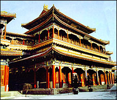 雍和宮は清代康煕三十三年(1694)に建立された。北京地區で規模最大、最も完全な形で殘存するラマ教(チベット仏教)黃教の寺院。廟は南に向かって立ち、南から北へと牌樓院、昭泰門、天王殿、雍和宮殿、永佑殿、法輪殿、萬福閣などが並んでいる。
