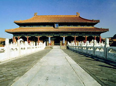 和殿、中和殿と保和殿を中心とし、皇帝が重要な式典を行い、大臣たちを呼び寄せて會見し、権力を行使する所である。太和殿は高さ35.5メートル、明?清両代においては北京で最も高い建築物で、皇帝のこの上もない権力を象徴するものであった。新しい皇帝の即位、皇帝の成婚の式、皇后の冊封、科挙制度の最高の試験、さらに毎年の元旦、冬至、皇帝の生誕の日に百官が皇帝に謁見し食事を賜われるなどの重要な儀式はすべてここでとり行われた。北側にある內庭は乾清宮、交泰殿、坤寧宮を中心とし、皇帝、皇后と妃らが住み、日常の政務をたずさわる所である。故宮はその建築技術によって國內外に知られ、その建築物群は雄大なスケールを誇り、華麗で堂々としており、どの裝飾をとってみても人々に思いを巡らせるものがある。故宮にはさらに商、周の時代から清の末期までの百萬點にのぼる貴重な文物が収蔵されており、観光客を引き付けている。1987年にユネスコによって『世界の文化遺産』に登録された。