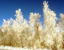 中國北東部を縦斷する大興安嶺山脈の中央部にある阿爾山(內蒙古自治區)は、海抜が高く、鬱蒼(うっそう)とした林に覆われ、晝夜の溫度差が大きいため、霧氷ができやすい。現地ではこのほど、約50キロメートルにわたる「霧氷の回廊」が現れた。マツやシラカバ、ヤナギの枝や葉が、透明にきらめく氷に包み込まれ、不思議な形を作りだしている。