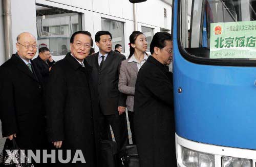 寫真は3月2日、北京に到著したマカオの全人代代表たち。