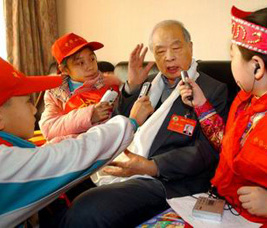 寫真:邵華沢?全國政協委員(元人民日報社編集長、元同社社長)を取材する広東省と內蒙古自治區の少年記者たち。「立派な記者になる方法」について質問している。