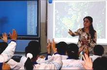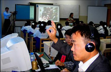 寫真(左):普通話の授業(yè)をする教員?阿依努爾さん。自治區(qū)內(nèi)では、16地區(qū)?州の100校余りで、少數(shù)民族の學(xué)生が2言語の遠(yuǎn)隔教育システムによる授業(yè)を同時に受けている。